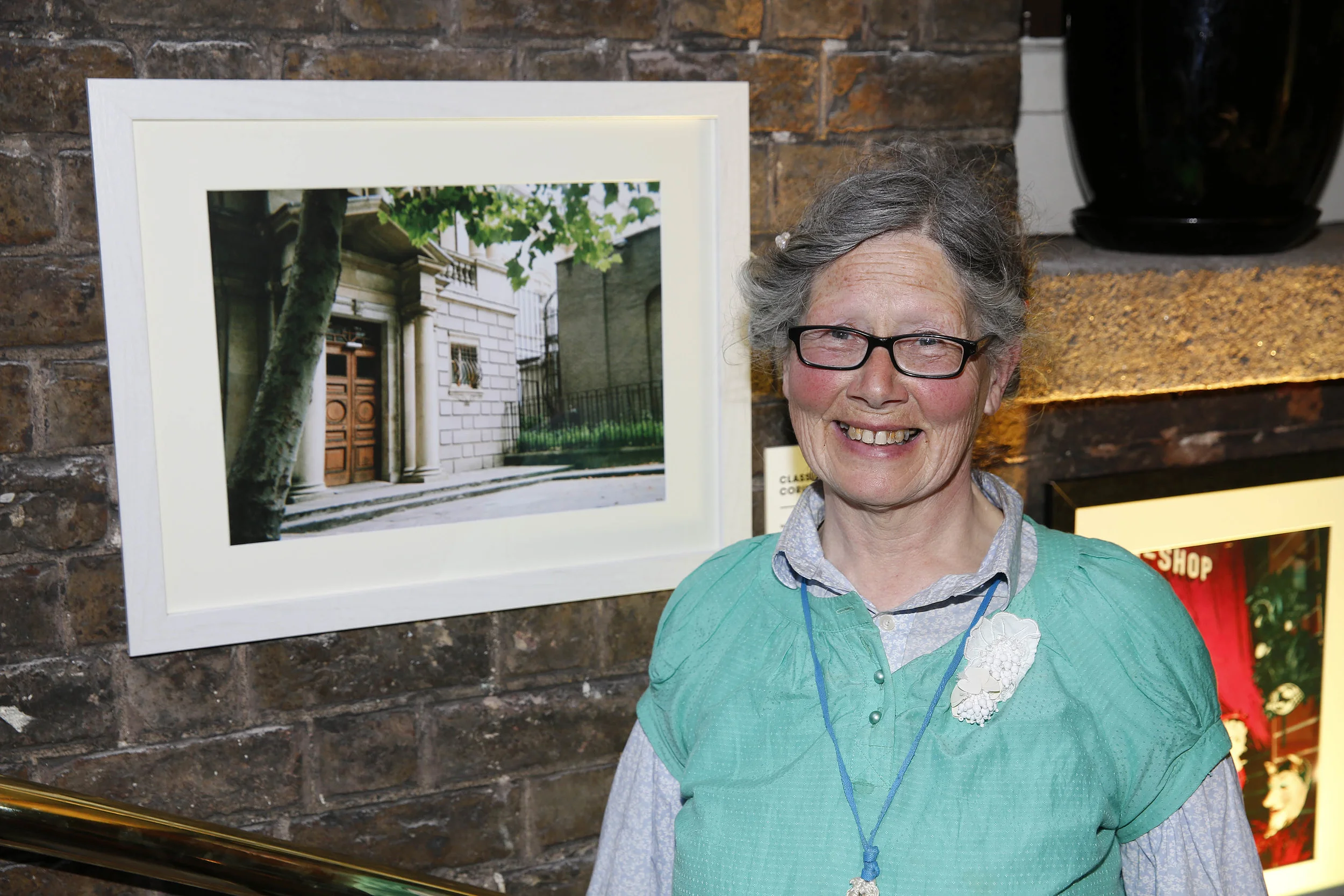 One of our IN SIGHT photographers Ramblin' Rose beside her photograph 'Classical Doors with Corinthian Pillars.'